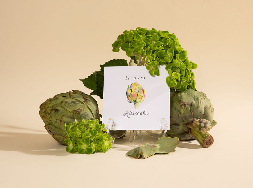 Curated watercolor cards capturing each stage of pregnancy, featuring fruits and vegetables to symbolize the weekly growth of the baby. Set includes 19 Cards (Cover + Double-Sided 5x5 for Weeks 5-40 on premium card stock) & Acrylic Stand for Display.
